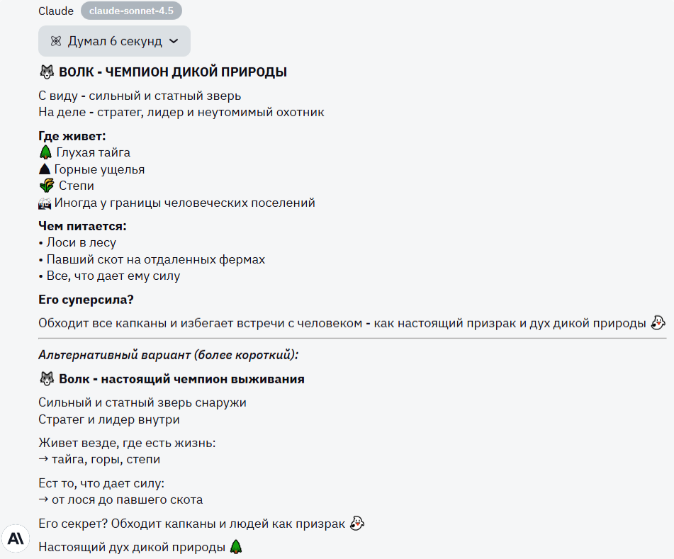 Как будто мою жалобу услышали, Claude решил сделать все простыми предложениями, не добавляя маркированный список. Правда, несмотря на такой плюс для меня, модель слишком сократила текст, потеряв некоторые детали, в связи с чем и получает два балла к своему счету.