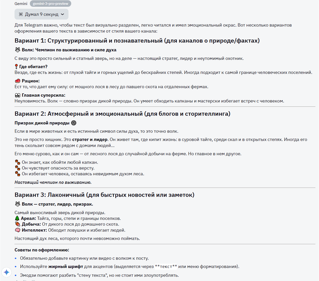 Как и в случае с ChatGPT, текст ощущается слишком сухо. Модель накидала эмодзи, но какой-то качественной адаптацией для телеграмм это не является.