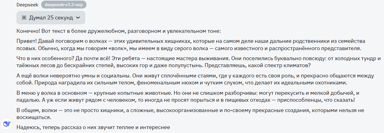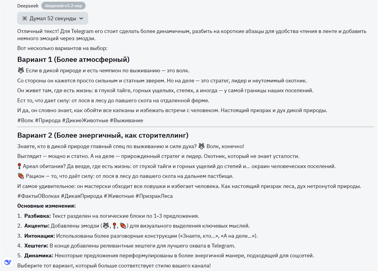 DeepSeek тоже представил несколько вариантов. Второй, пожалуй, самый приятный: дружелюбный, с обращением, восклицаниями, эмоциональными оценками. Единственное, что меня смущает - хэштеги. Не помню чтоб их хоть кто-то писал в ТГ. Поэтому все же срежу балл.