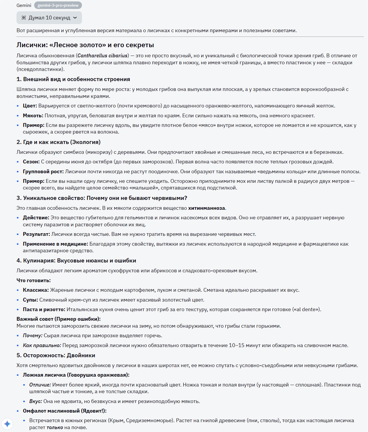 Gemini тоже насыпал много полезной статьи, но такой формат (аналогичный ChatGPT) мне просто режет глаз. Как бы не был хорош результат, но вот эта тонна маркированных списков, различных выделений слов просто не дает мне поставить максимальный балл.