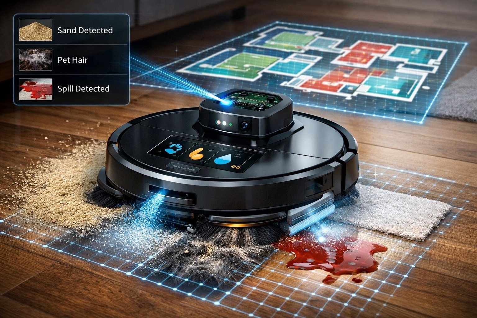 Для каждого типа - своя тактика. Песок - максимальная мощность всасывания и медленный проход. Шерсть - включение антистатической щетки и особый паттерн движения против шерсти. Пролитый сок - сначала осторожное впитывание специальной насадкой, затем влажная уборка.