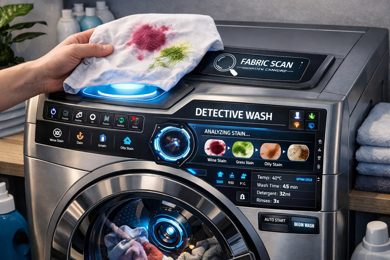 Перед загрузкой вы на секунду подносите вещь к сканеру на панели управления (или он встроен в барабан). Датчики определяют тип ткани, цвет, а камера с ИИ анализирует тип и возраст пятен (жировое, белковое, винное, трава).