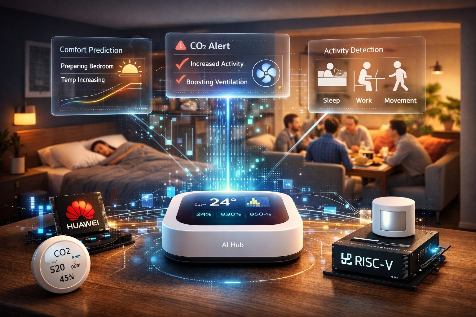 5. Система микроклимата с предсказанием (на базе Huawei Ascend в хабе или Alibaba Cloud + локальные RISC-V датчики)