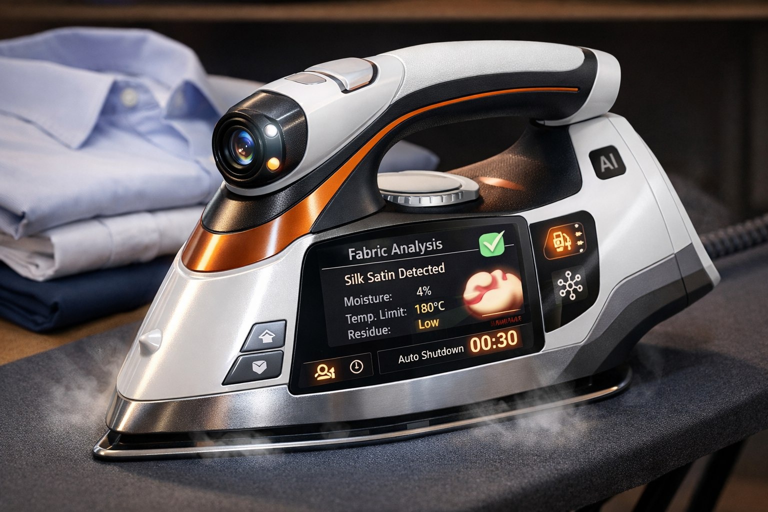NPU сопоставляет данные с библиотекой из тысяч материалов и моментально выбирает единственно верный режим. Больше не нужно гадать между двумя точками на режиме шёлке, утюг сам знает, что перед ним - креп-сатин или атлас.