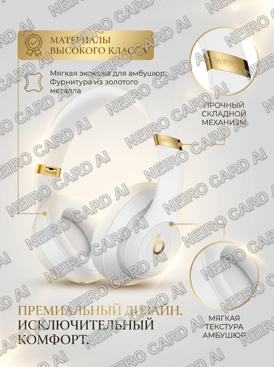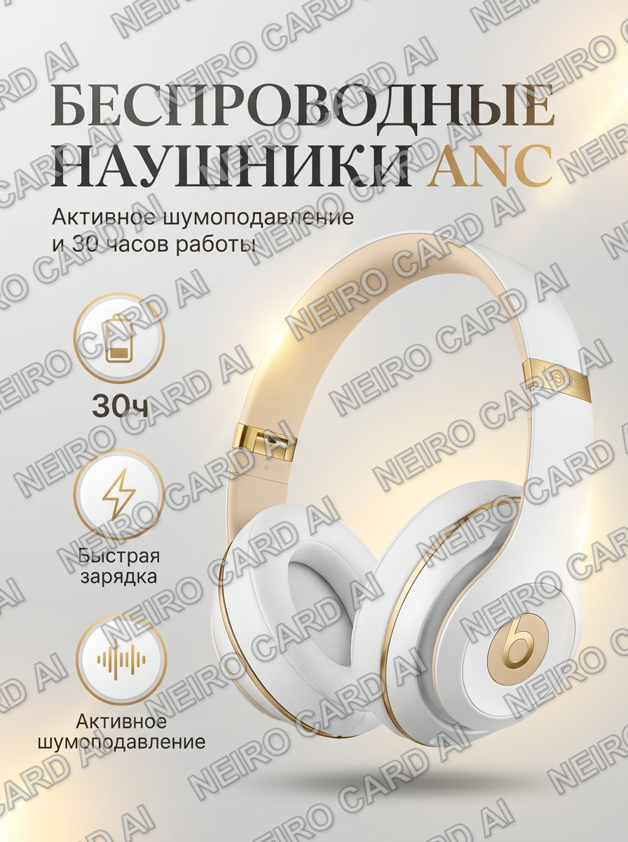 Промт для генерации: “Карточка товара для Wildberries: беспроводные наушники с активным шумоподавлением. Крупный план, ракурс 3/4, чтобы были видны форма и эргономичность. На фоне - минималистичный градиент от светло‑серого к белому. Тёплый нейтральный свет, акцент на текстурах материалов (пластик/металл/кожа). Фотореализм, высокое разрешение”.