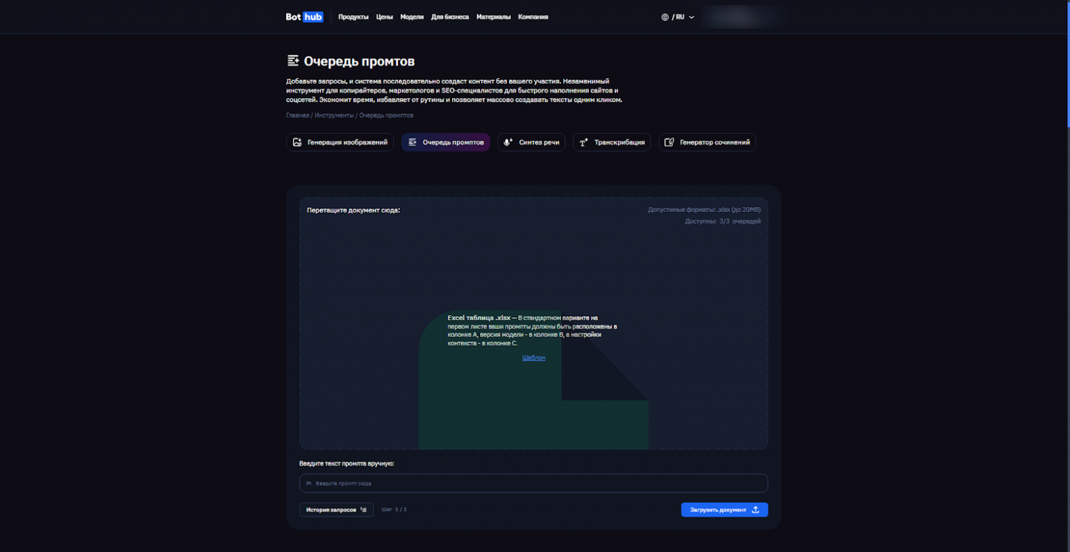 Реализовали очередь промптов для пакетного создания контента. Теперь цепочку из промптов можно вводить вручную или загрузить Excel-файлом. Например, вы можете задать формат описания товара, а дальше загрузить очередью весь их перечень. Выбранная вами модель будет по очереди описывать каждый товар из списка по заданным критериям.