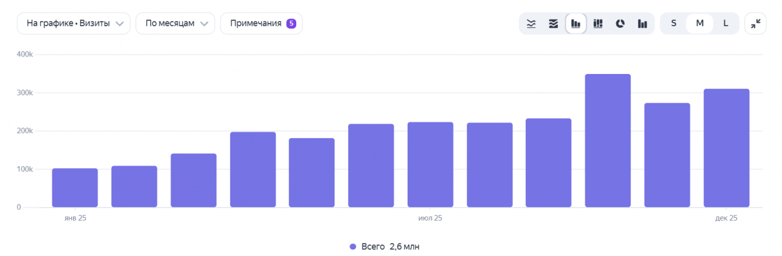 Каждый день наш агрегатор посещают от 8 до 10+ тысяч пользователей. Суммарно, сервис за 2025 год посетили 2,6 миллиона раз. Достаточно неплохой показатель прироста, если учитывать, что за 2024 год количество посещений равнялся 788,6 тысячам.