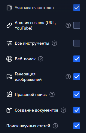 Добавили тулзы (инструменты). Теперь в настройках можно включить автоматический режим рассуждения. ИИ будет сам понимать, когда ему нужно искать информацию по источникам (интернет, ГАРАНТ, научные работы) и будет делать это, пока не найдёт нужное для ответа на заданный вопрос.