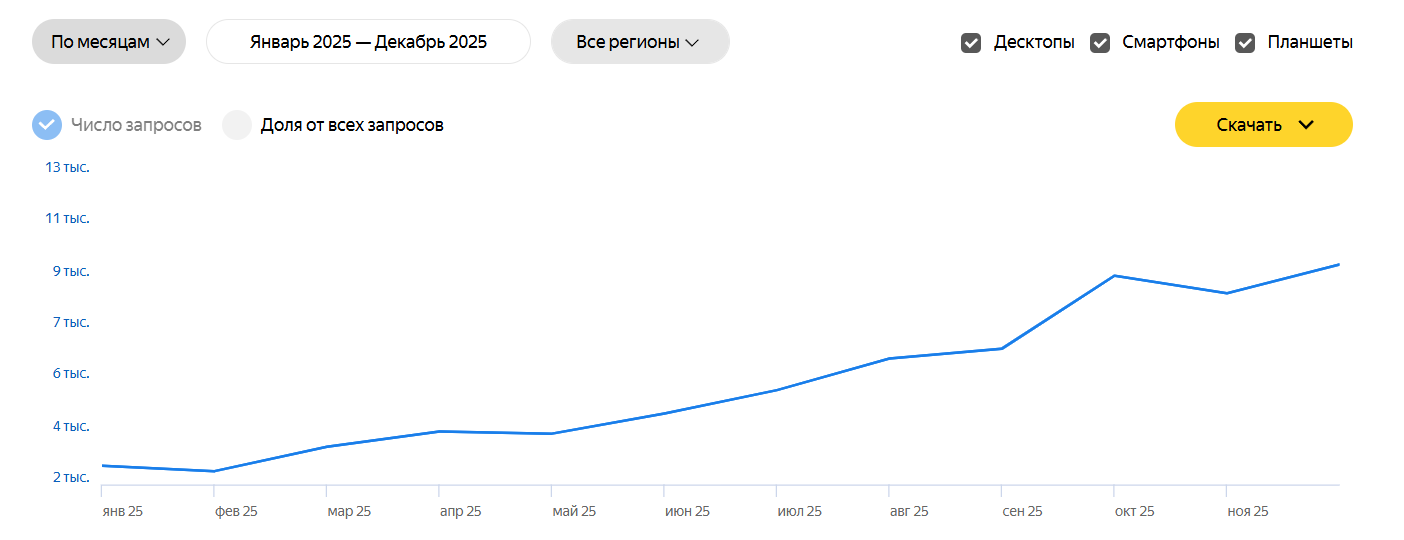 За 2024 год наш сервис искали 15 630 раз. Пик пришелся на декабрь, который набрал 2 549 поисковых запросов. В 2025 году наш сервис искали 65 430 раз (почти на 419% больше). И это только в Яндексе.