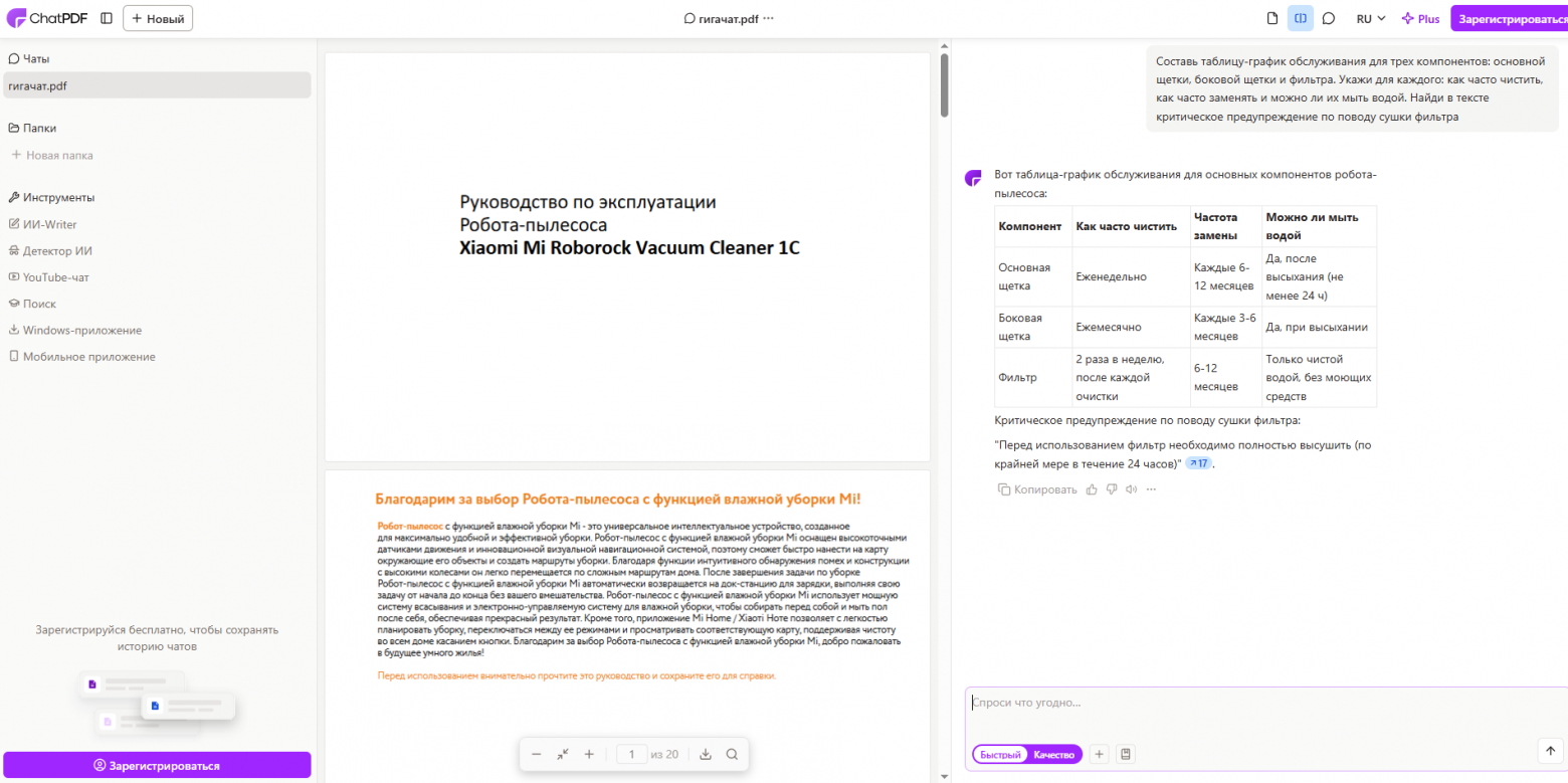 ChatPDF справился с третьим тестом довольно уверенно. Он смог собрать разрозненные данные из разных таблиц в одну понятную структуру. Особенно важно, что модель не пропустила предупреждение про сушку.